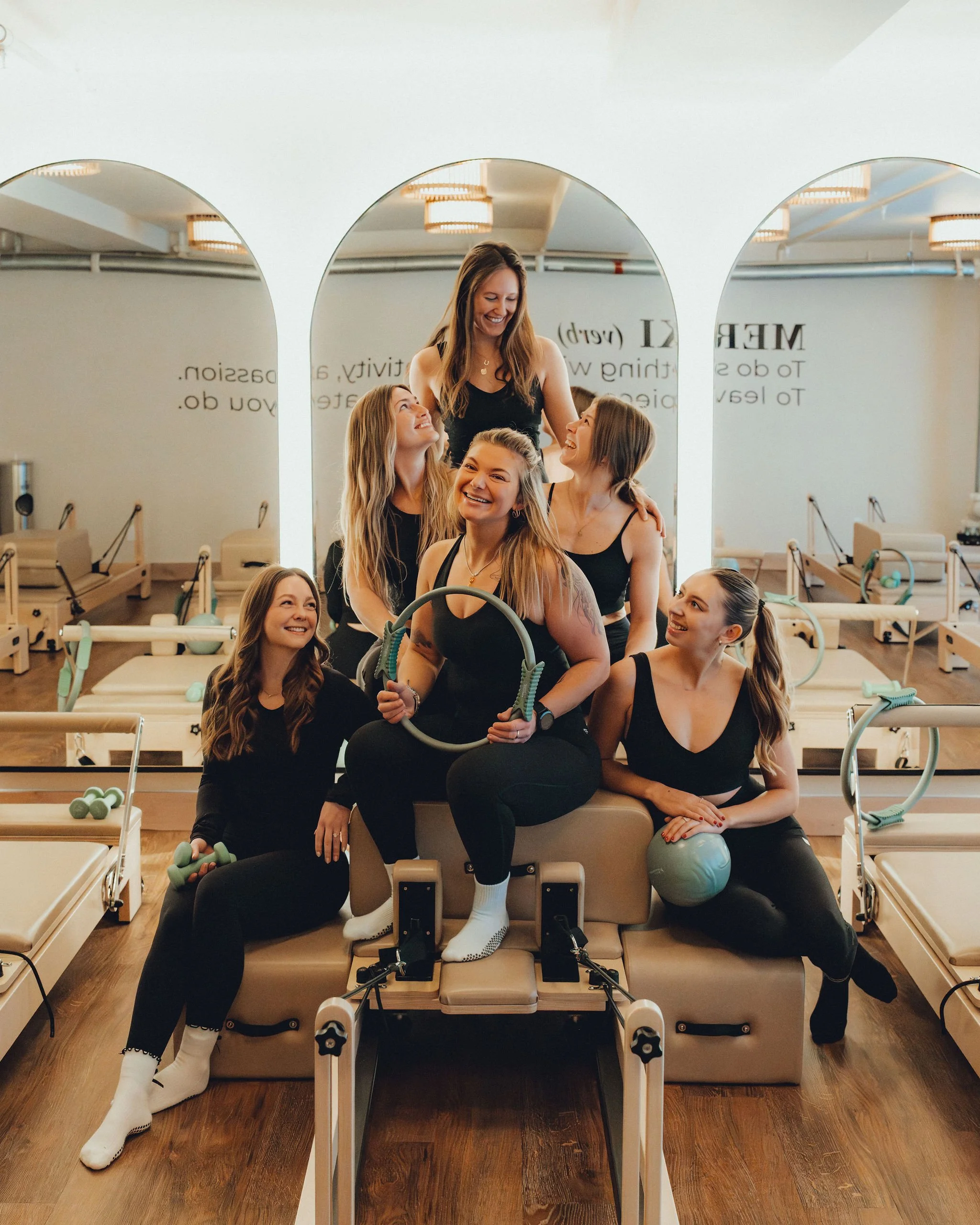 Contemporary high intensity pilates group classes performed on a classical reformer machine.